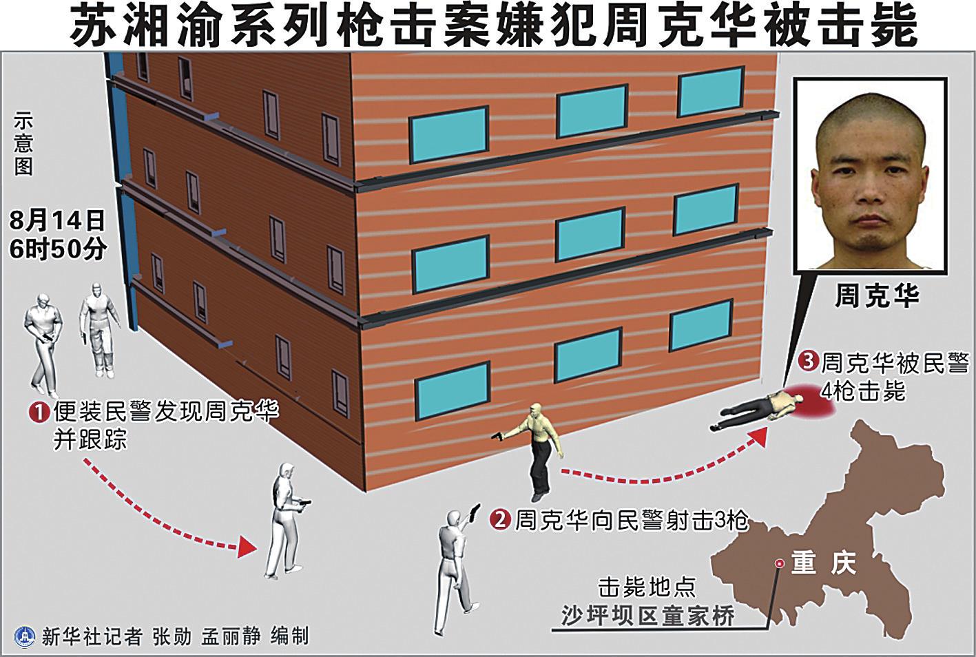 2012年8月14日凌晨6 时50分,在公安部统一指挥下,经过重庆等地公安机关连续数日艰苦奋战,犯下累累罪行的公安部A级通缉犯周克华在重庆沙坪坝区童家桥被公安民警成功击毙。周克华被击毙,但传说又说他感觉无法逃命而开枪自杀身亡。无论是自杀还是他杀,这已无关紧要,对两名民警共同将周克华击毙的英雄事迹不足称道了。可惜的是,周克华并没有被活捉,否则,本案在审理过程中,还会成为众多媒体争抢的鳌头。